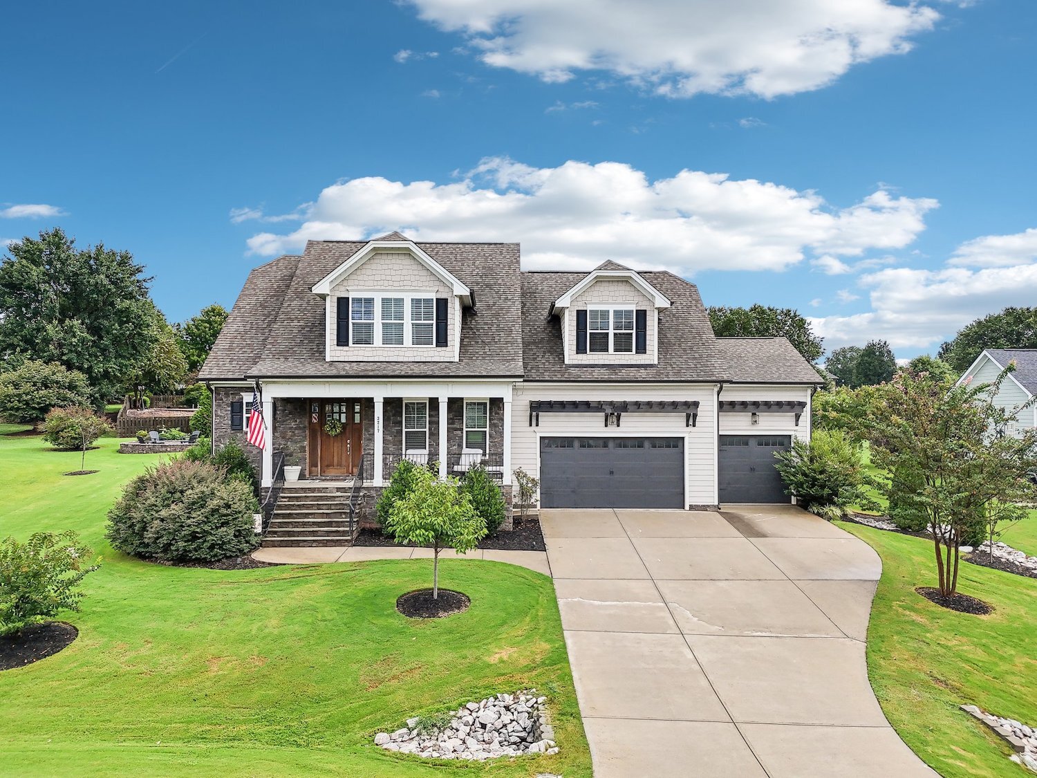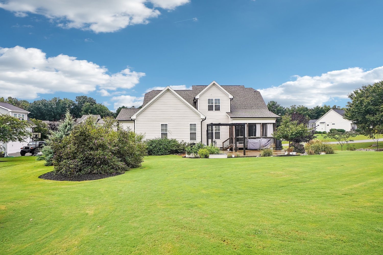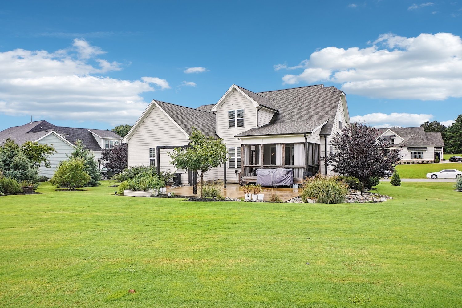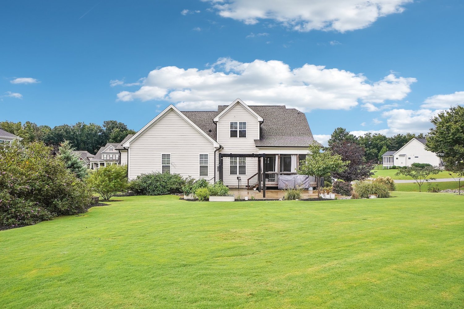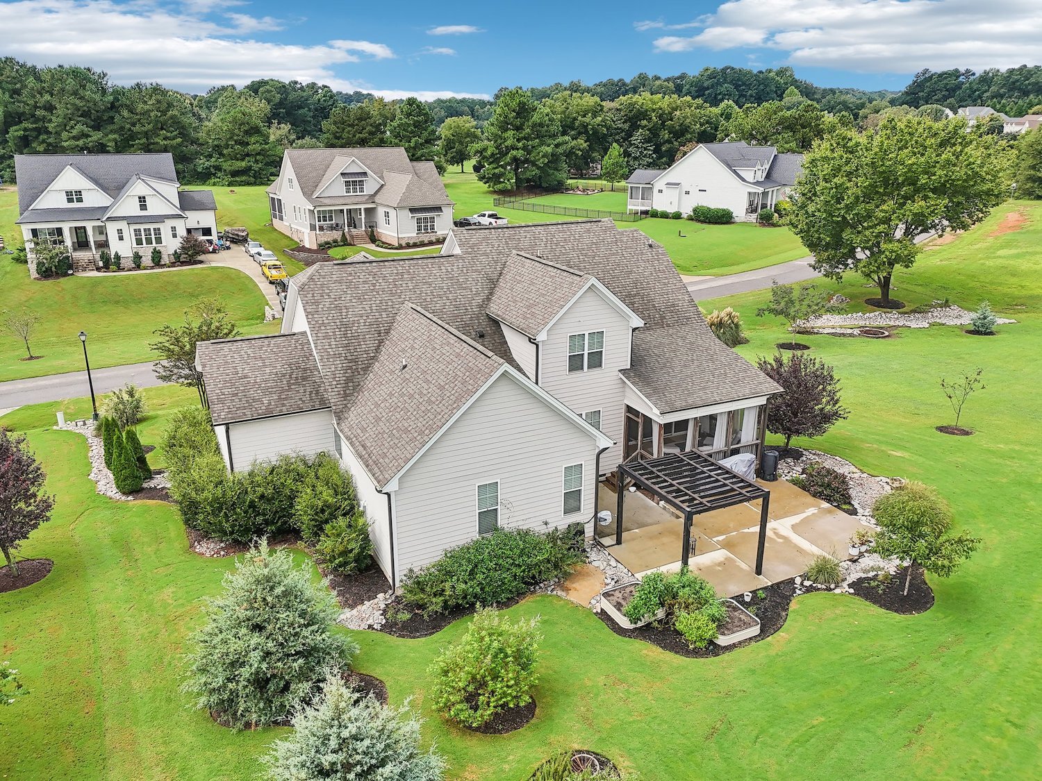 Welcome to this beautifully crafted custom home, offering like-new construction and thoughtful design throughout. Set on a spacious lot with an oversized yard, the property includes a 3-car garage and plenty of room for outdoor entertaining. Unwind in your private movie room or enjoy the neighborhood’s serene amenities, including two scenic ponds with fishing spots and picnic areas. The main level features a luxurious primary suite with a spa-inspired bath—complete with a walk-in shower and bench, quartz countertops, and a separate soaking tub. At the heart of the home is a gourmet kitchen that’s perfect for any cooking enthusiast, showcasing granite countertops, a gas range, double wall ovens, and under-cabinet lighting. The open living area is filled with natural light from large windows and enhanced by rich hardwood floors and elegant crown molding. A custom-stained mantel frames the cozy fireplace, while double sliding doors lead to a screened-in porch that opens to a stunning outdoor retreat featuring a gas fire pit and pergola. Additional highlights include a tankless water heater, a stylish Chevron shiplap accent wall, and thoughtfully placed windows that bring in abundant light throughout the home.