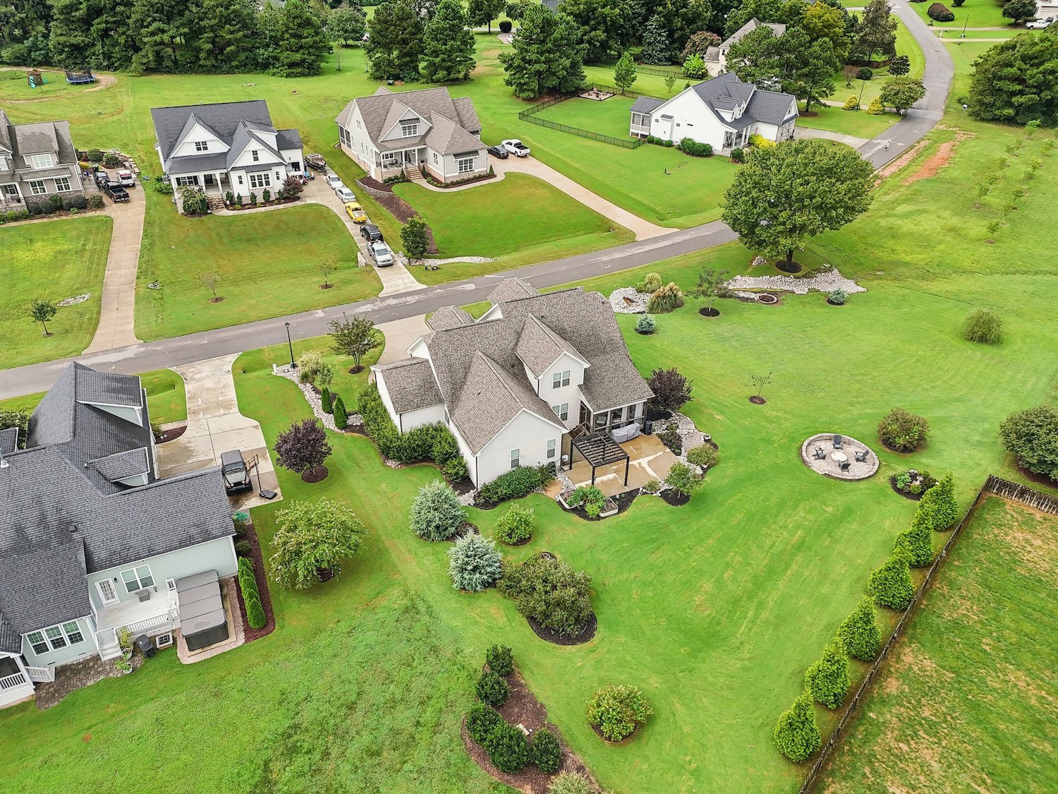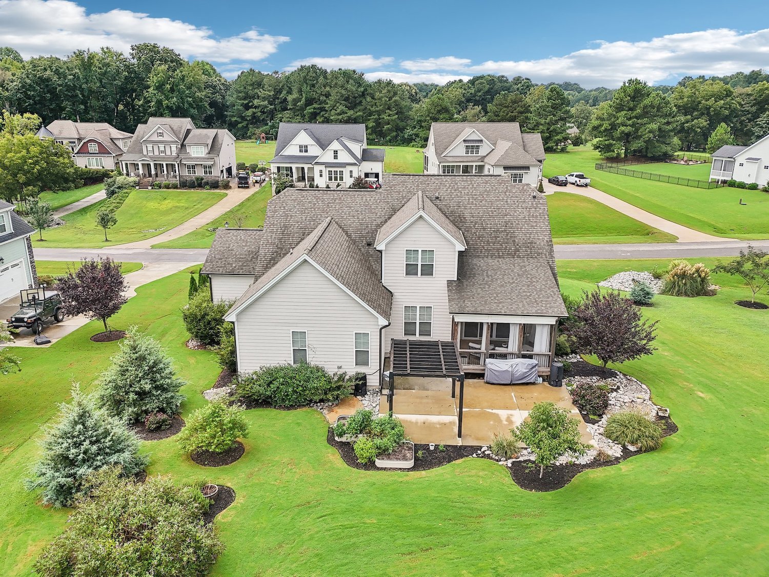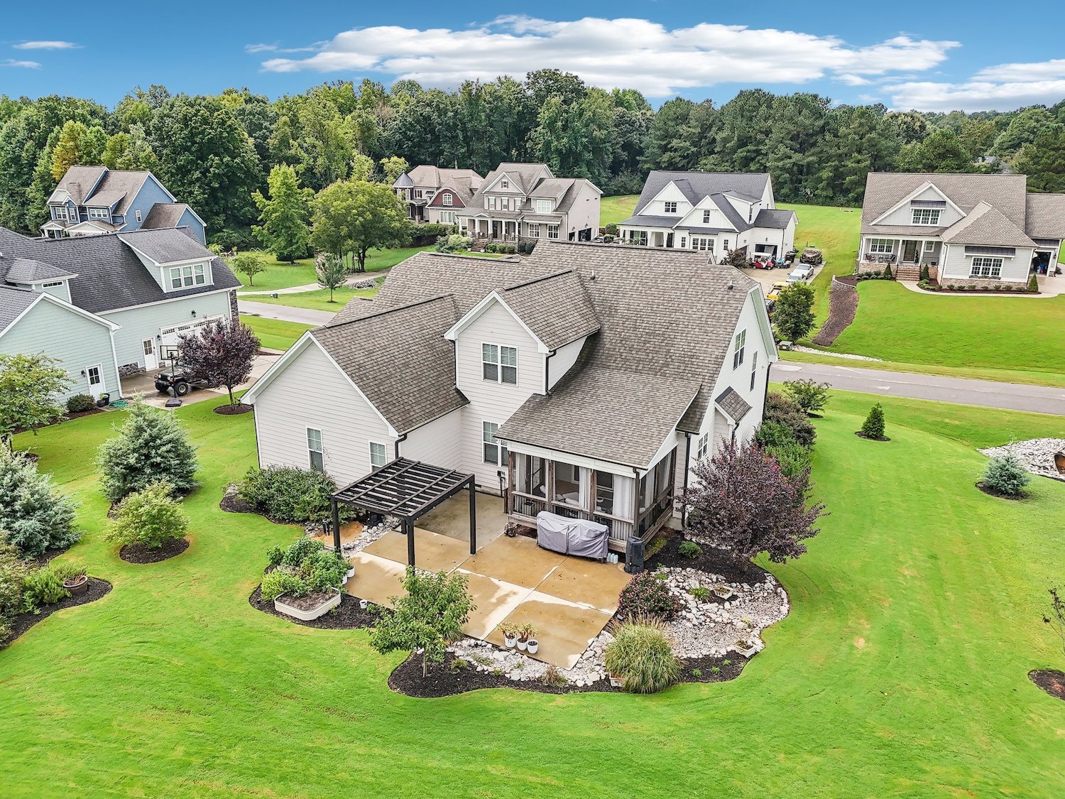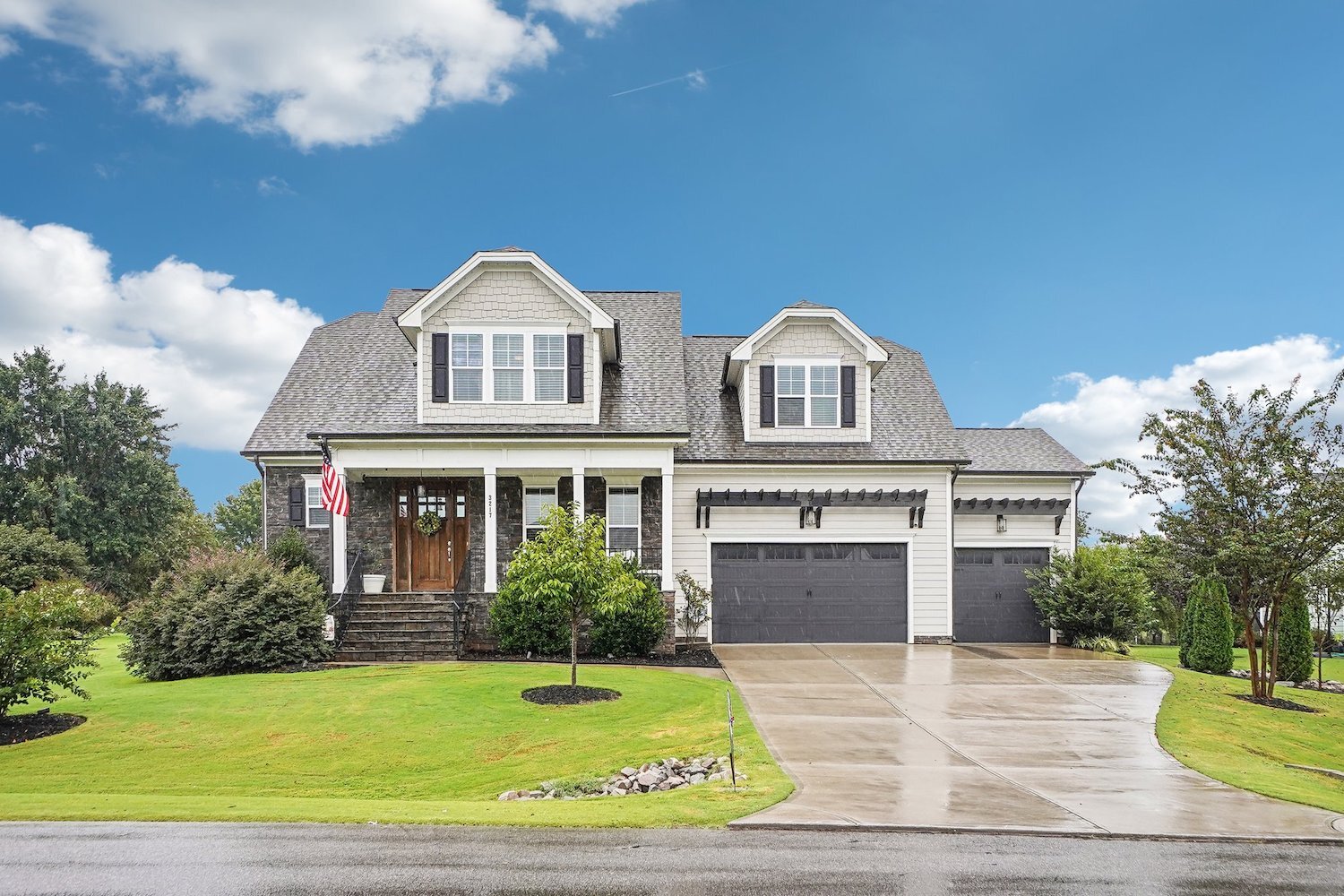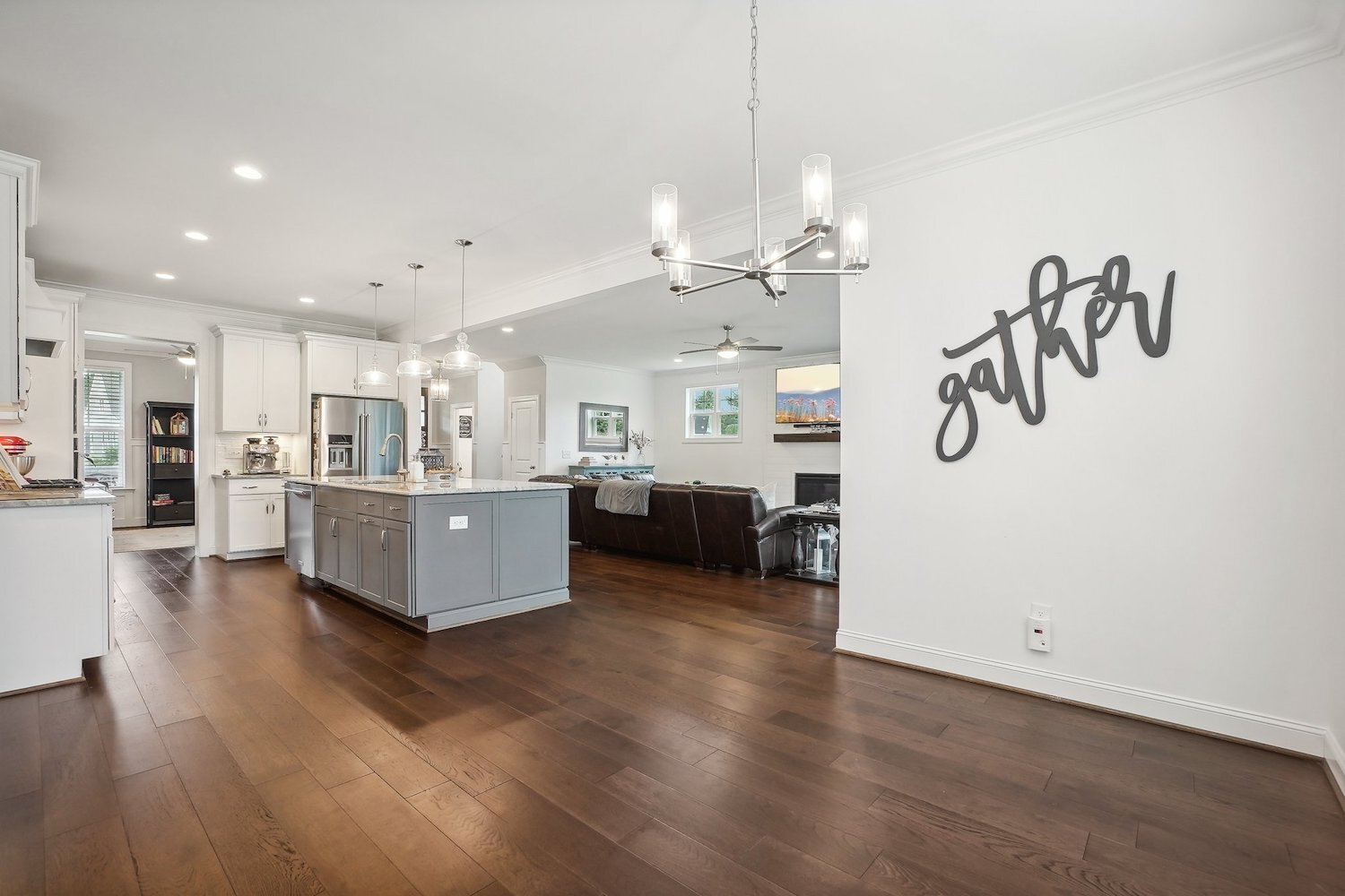 Welcome to this beautifully crafted custom home, offering like-new construction and thoughtful design throughout. Set on a spacious lot with an oversized yard, the property includes a 3-car garage and plenty of room for outdoor entertaining. Unwind in your private movie room or enjoy the neighborhood’s serene amenities, including two scenic ponds with fishing spots and picnic areas. The main level features a luxurious primary suite with a spa-inspired bath—complete with a walk-in shower and bench, quartz countertops, and a separate soaking tub. At the heart of the home is a gourmet kitchen that’s perfect for any cooking enthusiast, showcasing granite countertops, a gas range, double wall ovens, and under-cabinet lighting. The open living area is filled with natural light from large windows and enhanced by rich hardwood floors and elegant crown molding. A custom-stained mantel frames the cozy fireplace, while double sliding doors lead to a screened-in porch that opens to a stunning outdoor retreat featuring a gas fire pit and pergola. Additional highlights include a tankless water heater, a stylish Chevron shiplap accent wall, and thoughtfully placed windows that bring in abundant light throughout the home.