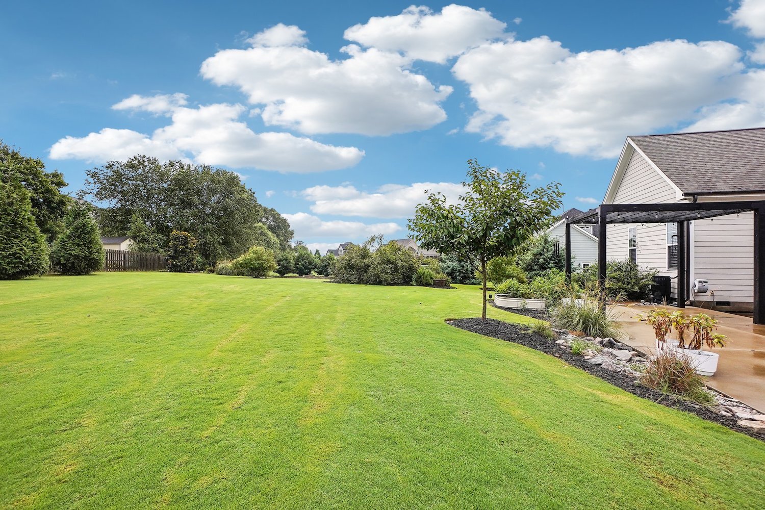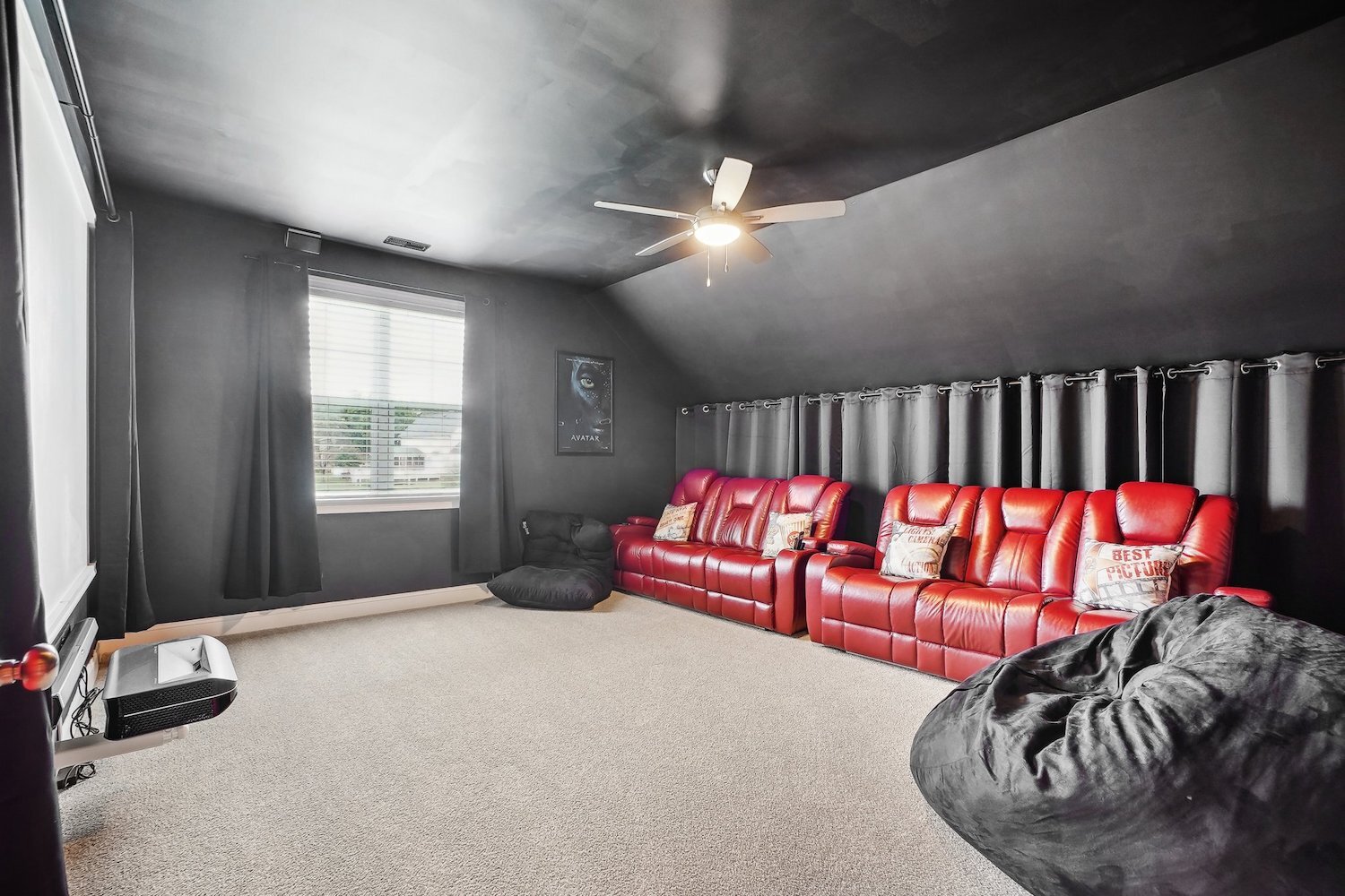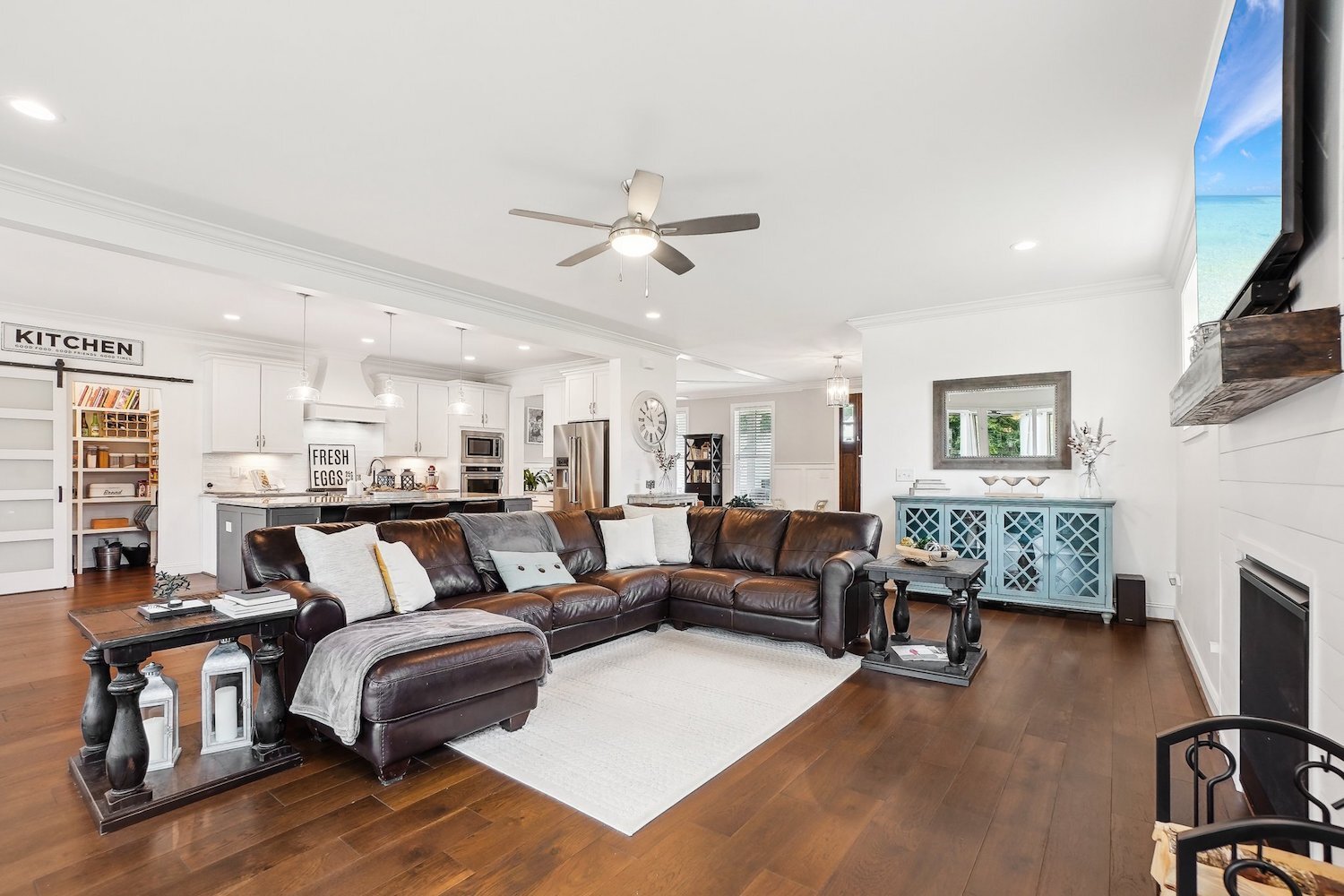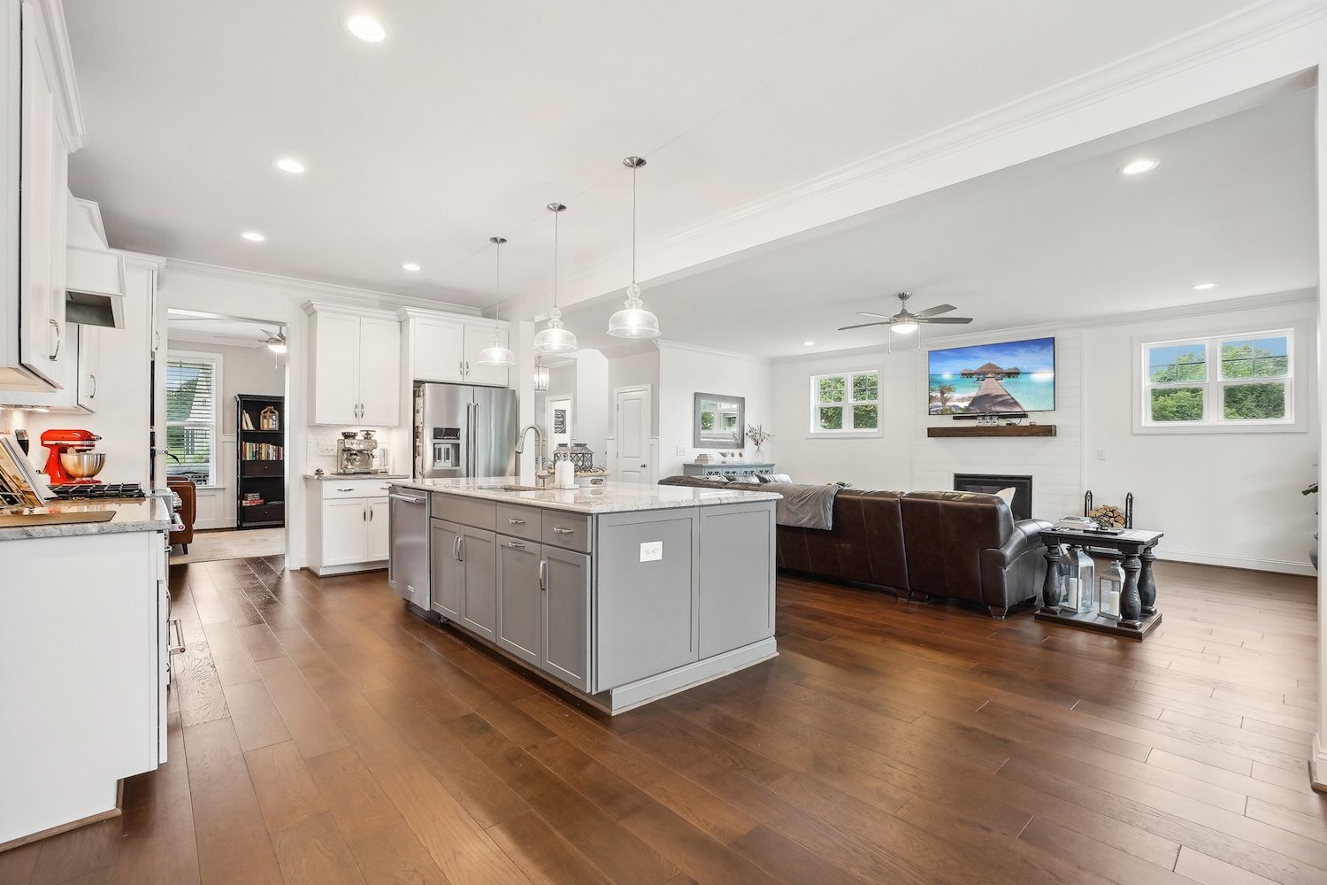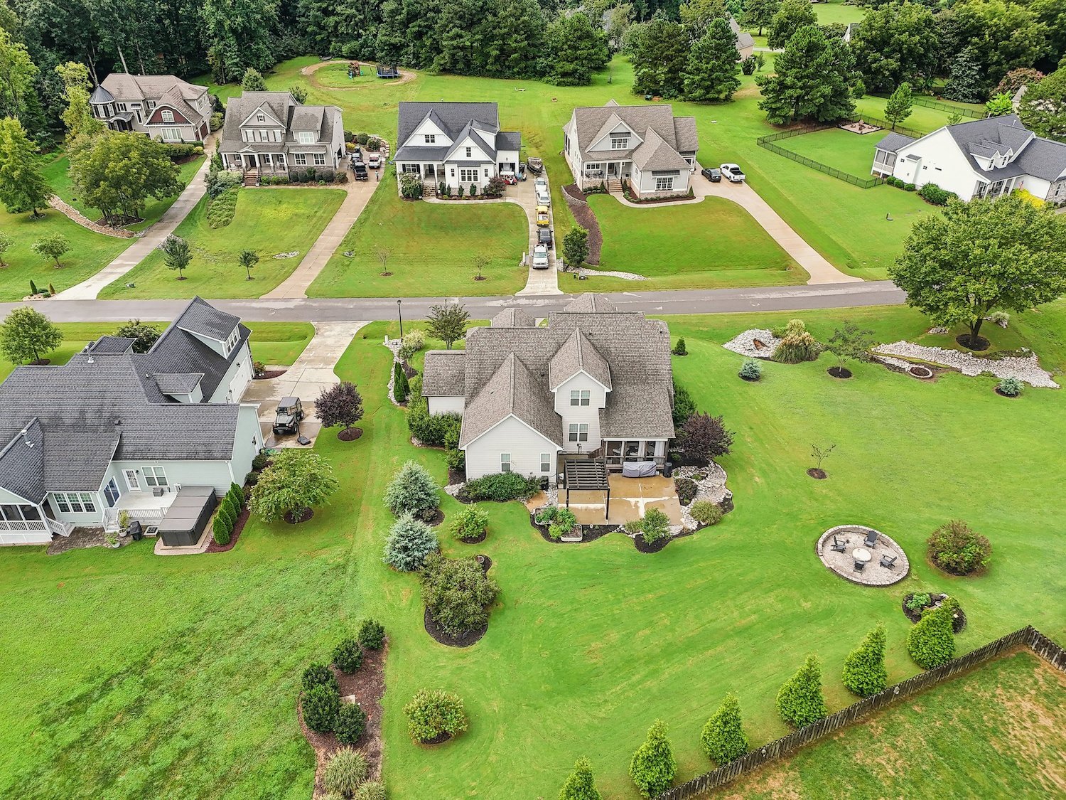 Welcome to this beautifully crafted custom home, offering like-new construction and thoughtful design throughout. Set on a spacious lot with an oversized yard, the property includes a 3-car garage and plenty of room for outdoor entertaining. Unwind in your private movie room or enjoy the neighborhood’s serene amenities, including two scenic ponds with fishing spots and picnic areas. The main level features a luxurious primary suite with a spa-inspired bath—complete with a walk-in shower and bench, quartz countertops, and a separate soaking tub. At the heart of the home is a gourmet kitchen that’s perfect for any cooking enthusiast, showcasing granite countertops, a gas range, double wall ovens, and under-cabinet lighting. The open living area is filled with natural light from large windows and enhanced by rich hardwood floors and elegant crown molding. A custom-stained mantel frames the cozy fireplace, while double sliding doors lead to a screened-in porch that opens to a stunning outdoor retreat featuring a gas fire pit and pergola. Additional highlights include a tankless water heater, a stylish Chevron shiplap accent wall, and thoughtfully placed windows that bring in abundant light throughout the home.