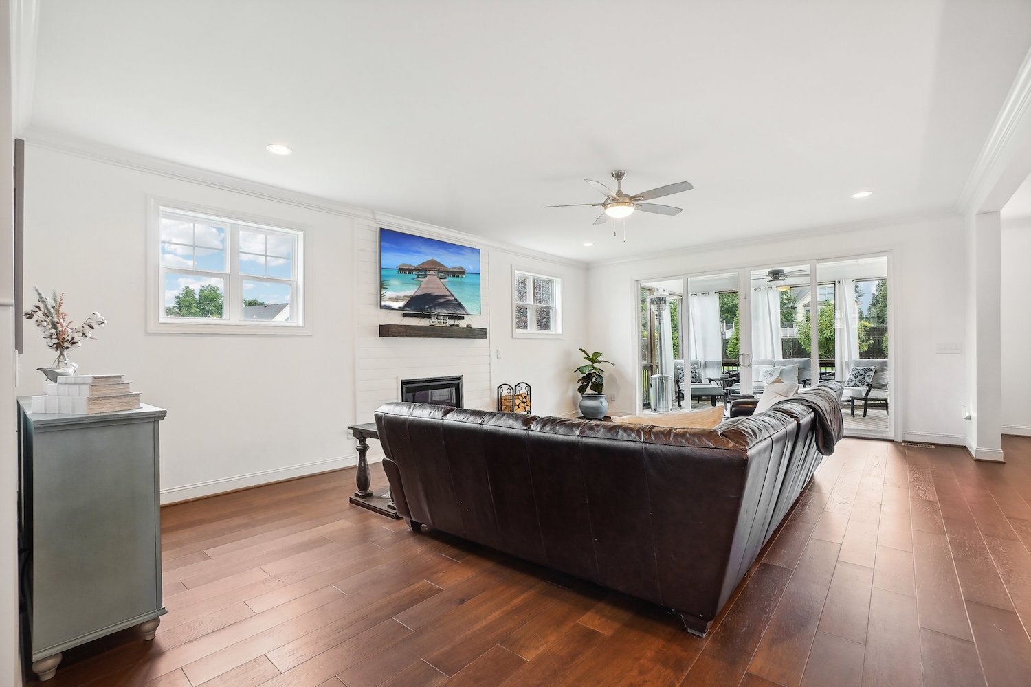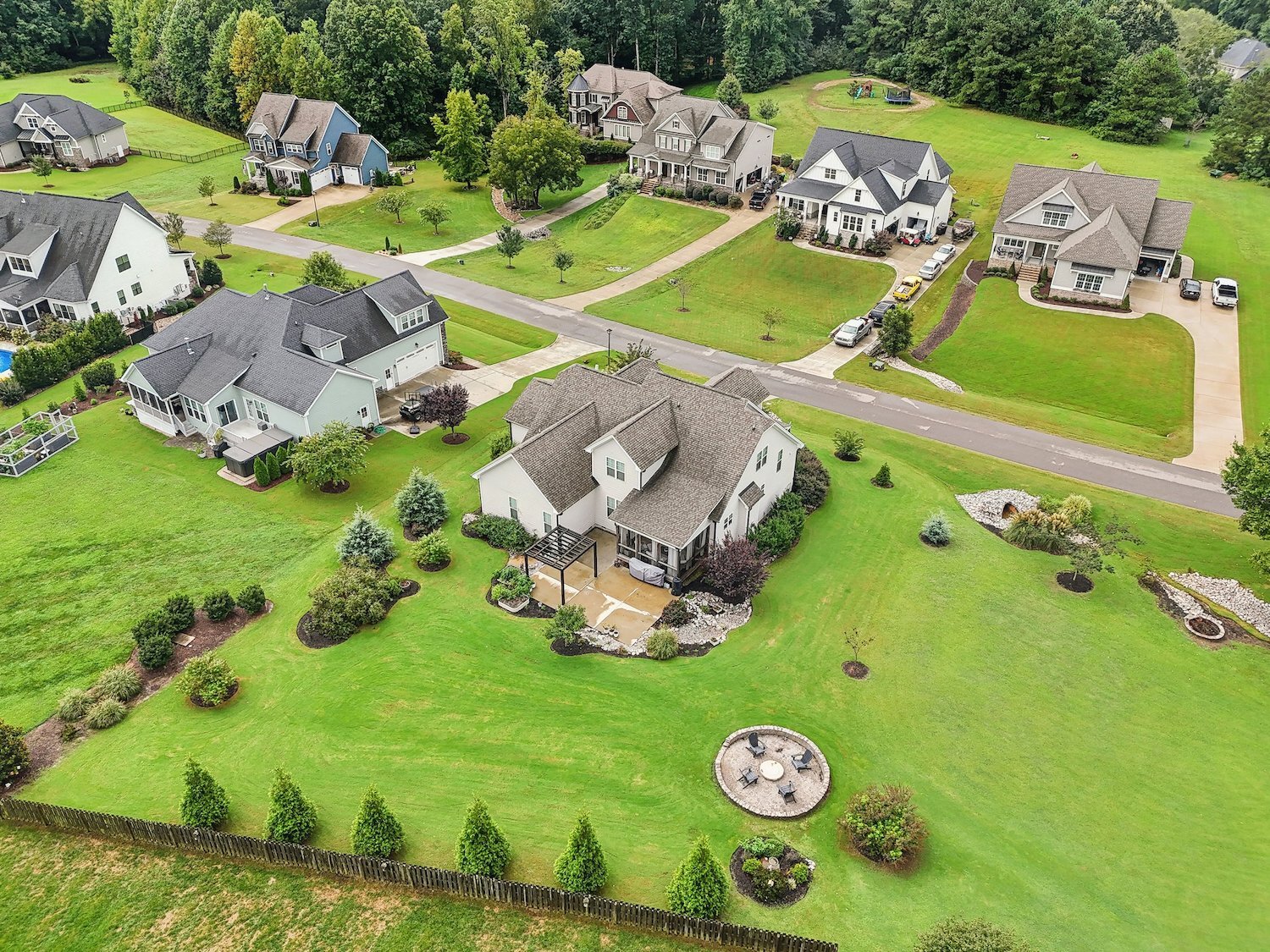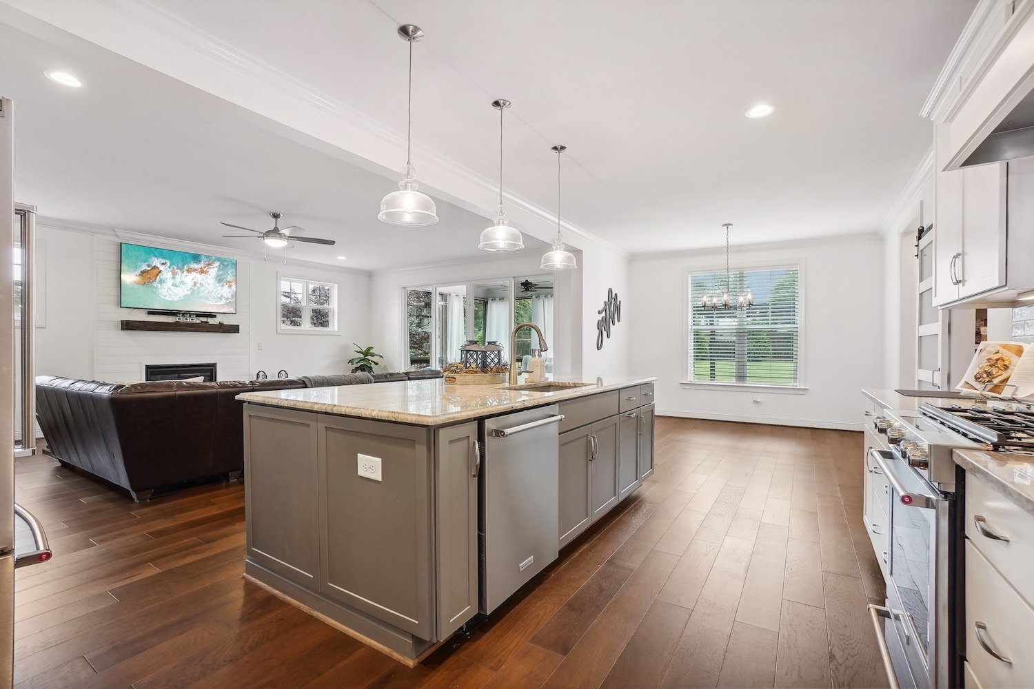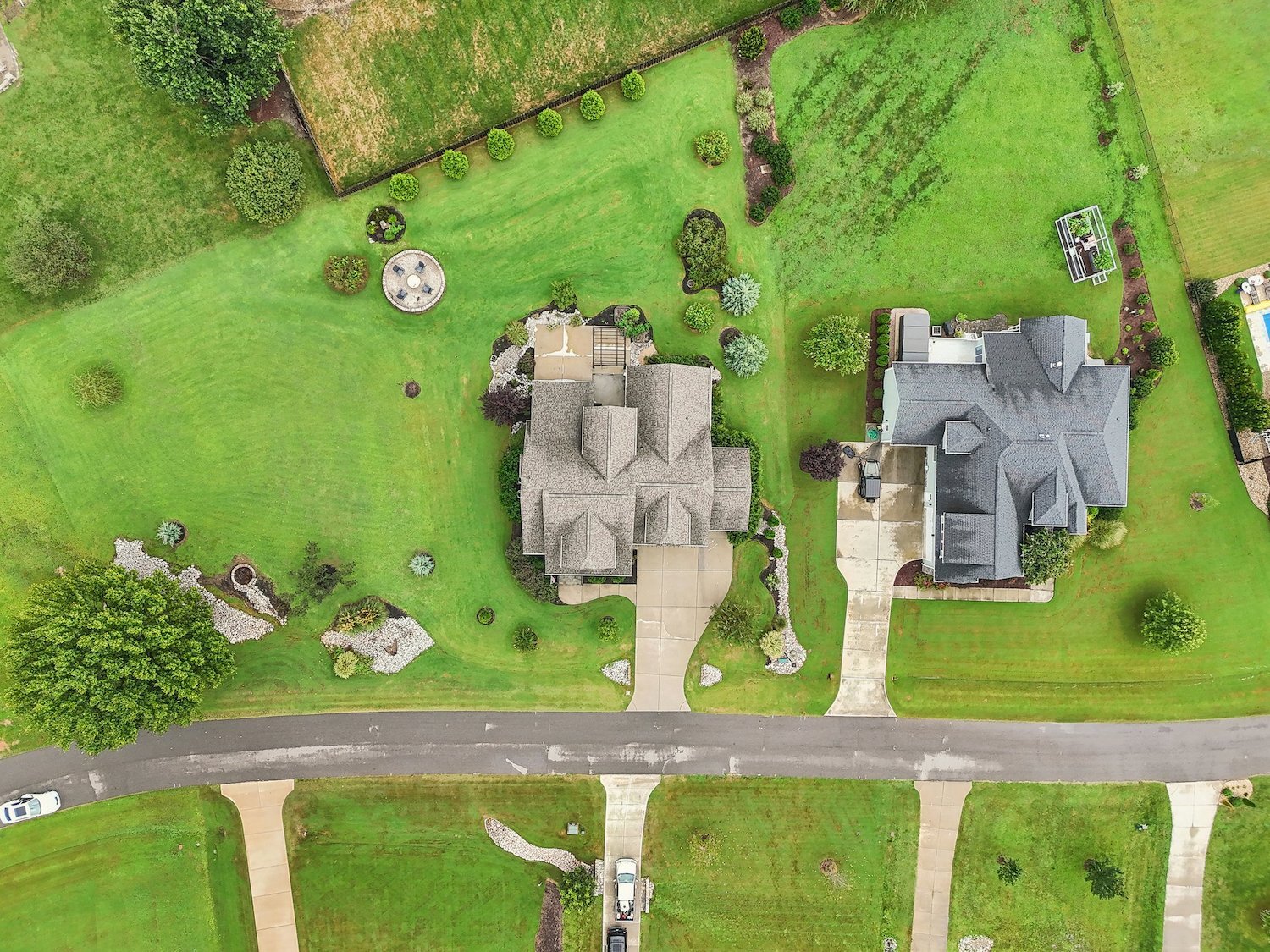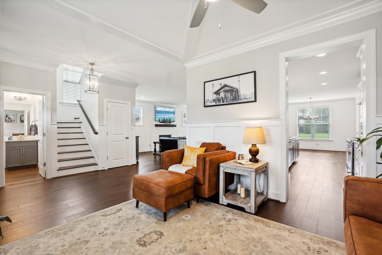 Welcome to this beautifully crafted custom home, offering like-new construction and thoughtful design throughout. Set on a spacious lot with an oversized yard, the property includes a 3-car garage and plenty of room for outdoor entertaining. Unwind in your private movie room or enjoy the neighborhood’s serene amenities, including two scenic ponds with fishing spots and picnic areas. The main level features a luxurious primary suite with a spa-inspired bath—complete with a walk-in shower and bench, quartz countertops, and a separate soaking tub. At the heart of the home is a gourmet kitchen that’s perfect for any cooking enthusiast, showcasing granite countertops, a gas range, double wall ovens, and under-cabinet lighting. The open living area is filled with natural light from large windows and enhanced by rich hardwood floors and elegant crown molding. A custom-stained mantel frames the cozy fireplace, while double sliding doors lead to a screened-in porch that opens to a stunning outdoor retreat featuring a gas fire pit and pergola. Additional highlights include a tankless water heater, a stylish Chevron shiplap accent wall, and thoughtfully placed windows that bring in abundant light throughout the home.