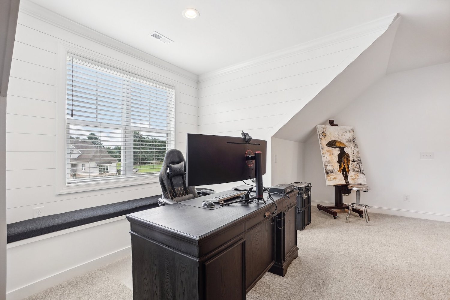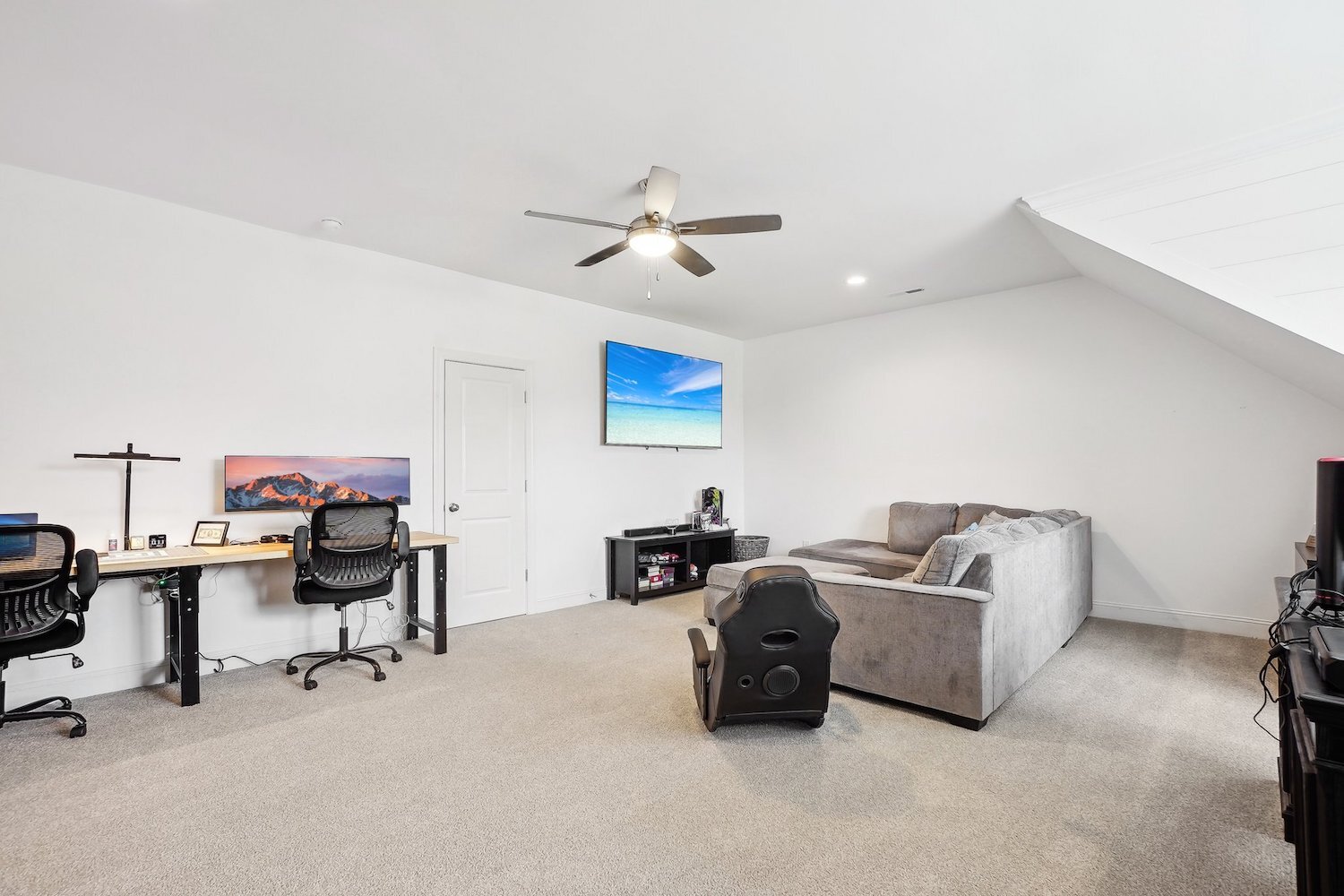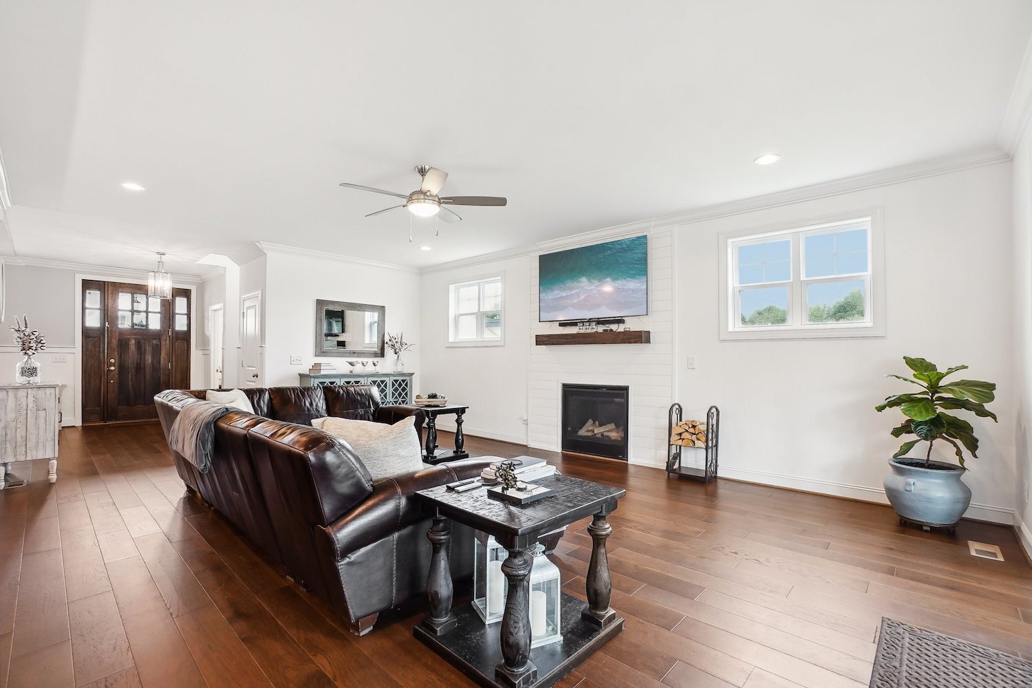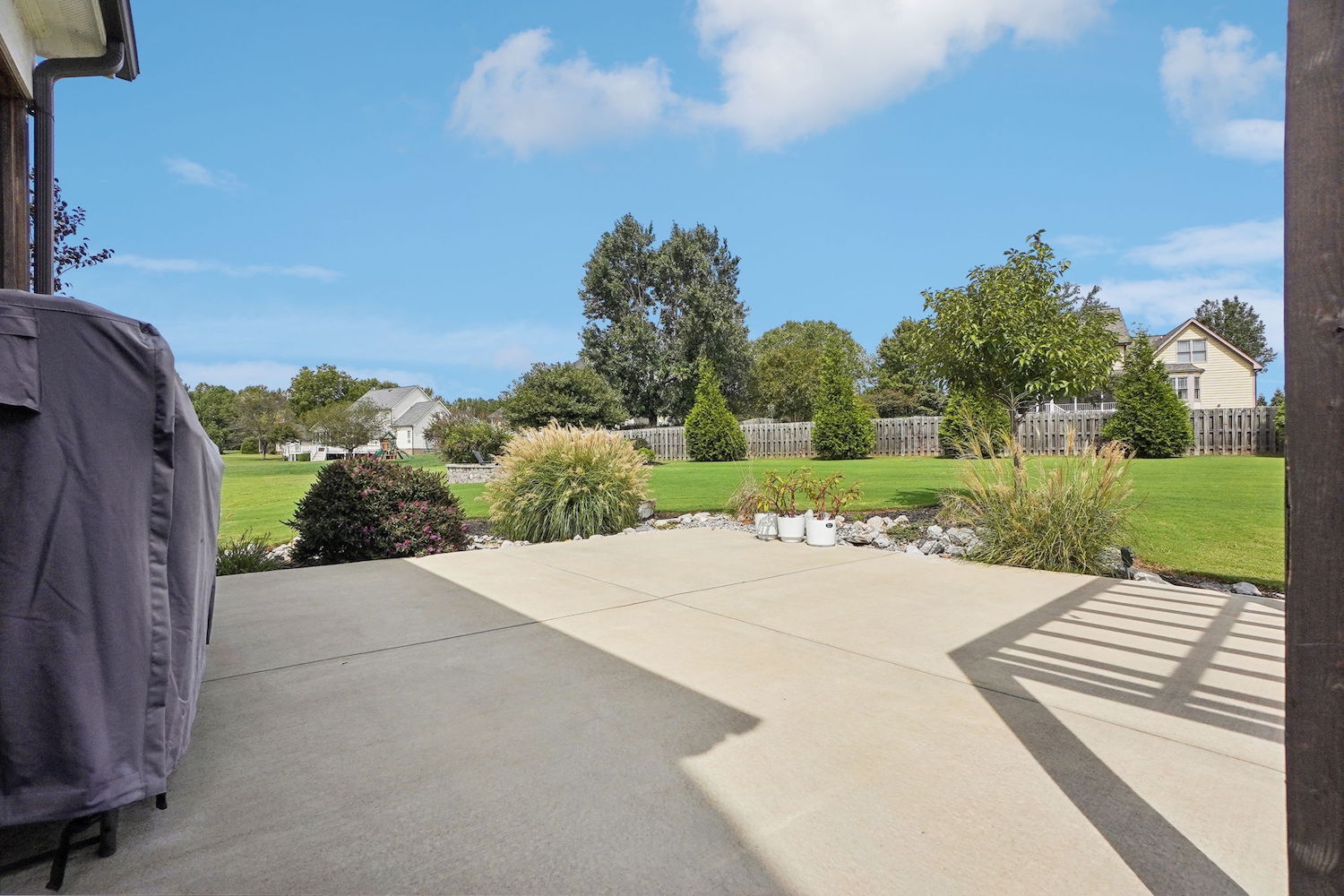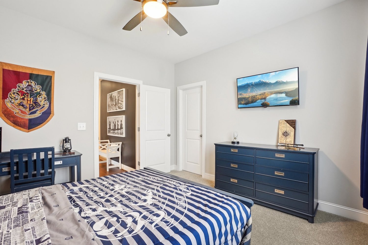 Welcome to this beautifully crafted custom home, offering like-new construction and thoughtful design throughout. Set on a spacious lot with an oversized yard, the property includes a 3-car garage and plenty of room for outdoor entertaining. Unwind in your private movie room or enjoy the neighborhood’s serene amenities, including two scenic ponds with fishing spots and picnic areas. The main level features a luxurious primary suite with a spa-inspired bath—complete with a walk-in shower and bench, quartz countertops, and a separate soaking tub. At the heart of the home is a gourmet kitchen that’s perfect for any cooking enthusiast, showcasing granite countertops, a gas range, double wall ovens, and under-cabinet lighting. The open living area is filled with natural light from large windows and enhanced by rich hardwood floors and elegant crown molding. A custom-stained mantel frames the cozy fireplace, while double sliding doors lead to a screened-in porch that opens to a stunning outdoor retreat featuring a gas fire pit and pergola. Additional highlights include a tankless water heater, a stylish Chevron shiplap accent wall, and thoughtfully placed windows that bring in abundant light throughout the home.