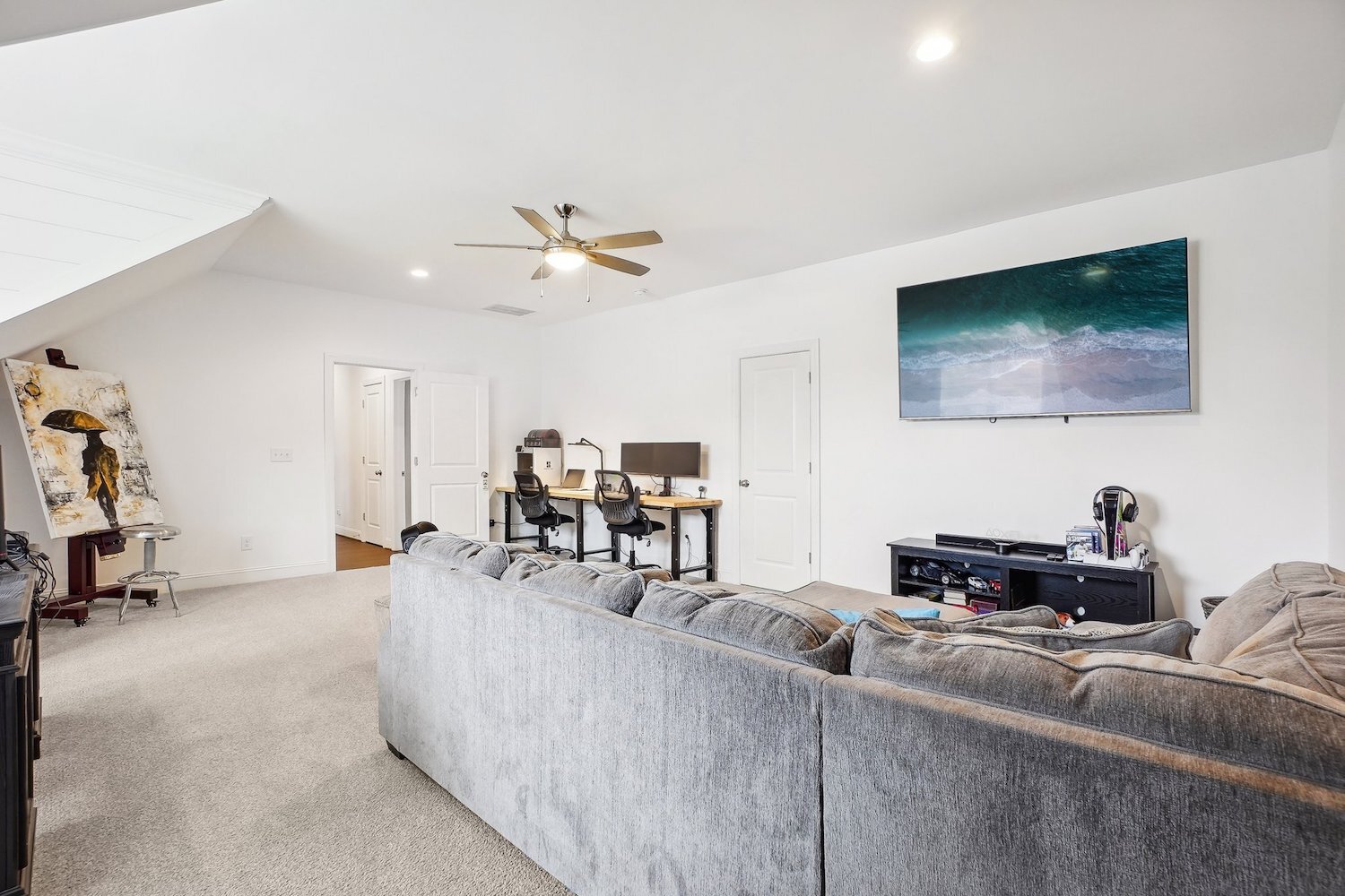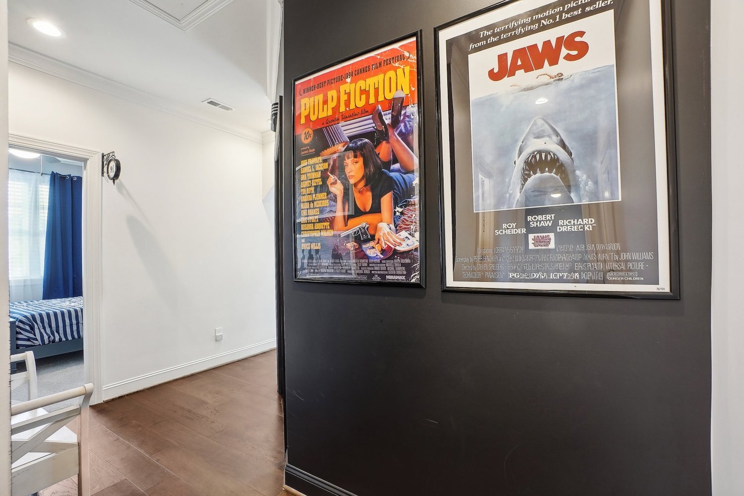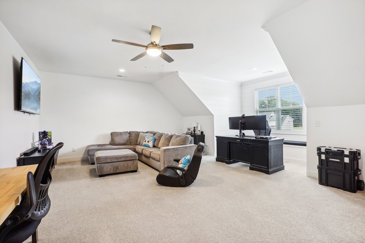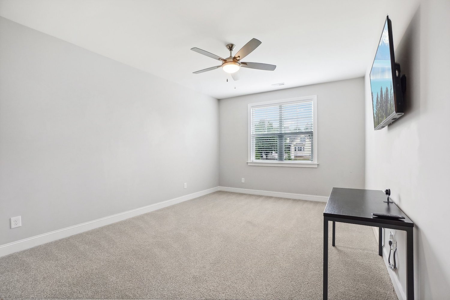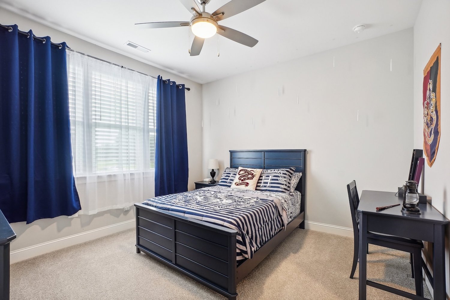 Welcome to this beautifully crafted custom home, offering like-new construction and thoughtful design throughout. Set on a spacious lot with an oversized yard, the property includes a 3-car garage and plenty of room for outdoor entertaining. Unwind in your private movie room or enjoy the neighborhood’s serene amenities, including two scenic ponds with fishing spots and picnic areas. The main level features a luxurious primary suite with a spa-inspired bath—complete with a walk-in shower and bench, quartz countertops, and a separate soaking tub. At the heart of the home is a gourmet kitchen that’s perfect for any cooking enthusiast, showcasing granite countertops, a gas range, double wall ovens, and under-cabinet lighting. The open living area is filled with natural light from large windows and enhanced by rich hardwood floors and elegant crown molding. A custom-stained mantel frames the cozy fireplace, while double sliding doors lead to a screened-in porch that opens to a stunning outdoor retreat featuring a gas fire pit and pergola. Additional highlights include a tankless water heater, a stylish Chevron shiplap accent wall, and thoughtfully placed windows that bring in abundant light throughout the home.