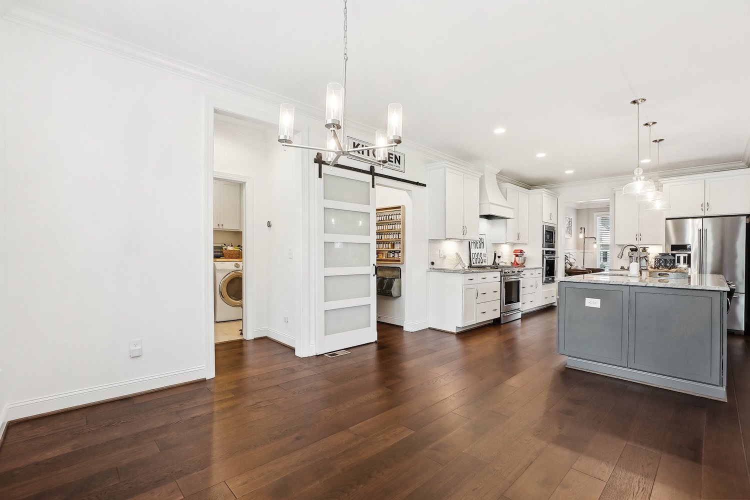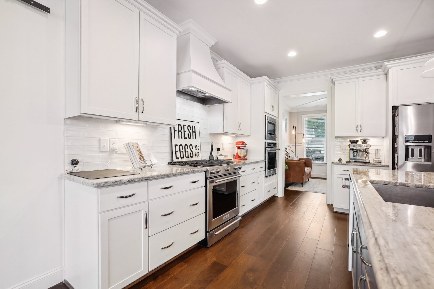 The heart of the home is the chef-inspired kitchen, complete with granite countertops, a gas range, double wall ovens, and under-cabinet lighting.